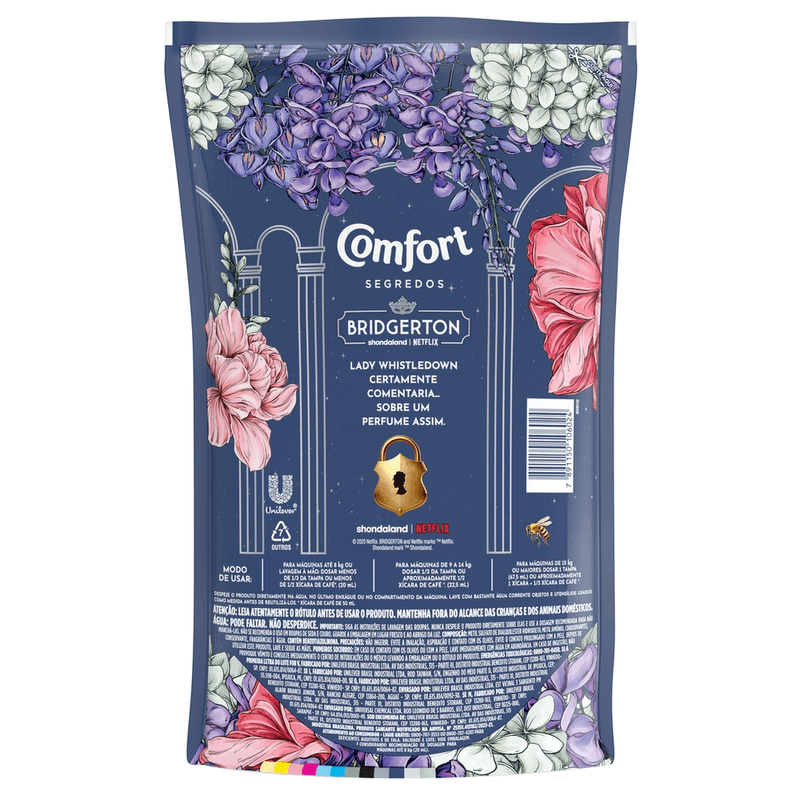 O Amaciante Concentrado Comfort Segredos Bridgerton possui um perfume misterioso, para que descubra o segredo mais perfumado da realeza. Desenvolvido em Edição Especial em parceria com a Netflix, este amaciante de roupas concentrado possui um perfume exclusivo que reúne os ingredientes mais requintados da perfumaria fina, que garantem uma fragrância sofisticada e marcante. O amaciante de roupas Comfort Segredos Bridgerton garante longa fixação dos perfumes, para que suas roupas fiquem perfumadas por muito mais tempo. Além de cuidar e fixar o perfume em suas roupas, o amaciante Comfort Segredos garante maciez aos tecidos, para roupas sempre impecáveis. Por ser concentrado, menos de meia tampinha basta para descobrir o segredo mais perfumado da realeza: para máquinas até 8 kg ou lavagem à mão, dosar menos de 1/3 da tampa (20 ml). Rende muito mais! Comfort Segredos concentrado possui perfume encapsulado que penetra no tecido durante o processo de lavagem de roupa, deixando-a muito mais cheirosa até mesmo depois de seca! O motivo? Quando você se movimenta, essas cápsulas de perfume se rompem e liberam essa fragrância misteriosa e incrível, fazendo com que aquele cheiro de perfumaria fina dure muito mais! Experimente Comfort Bridgerton Edição Especial: o segredo mais perfumado da realeza.