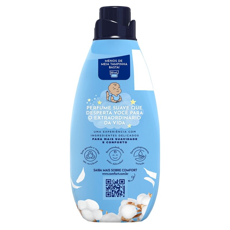 O Amaciante Concentrado Comfort Puro Cuidado tem perfume suave com extrato de aveia, recomendado para peles delicadas*** e faz as roupas durarem muito mais! Sua nova fórmula contém óleo de argan, um óleo natural com alto potencial nutritivo, que previne os danos da lavagem, mantendo as cores do tecido vibrantes por mais tempo, evitando a formação de bolinhas e esgarçamento**. Este amaciante de roupas contém extrato de aveia* que penetra profundamente nas fibras do tecido durante a lavagem, deixando-as com uma maciez irresistível, toque gentil e com todo cuidado que as peles sensíveis merecem. É livre de corantes e das microcápsulas de perfume, componentes com alto potencial de irritabilidade para as peles mais delicadas. Os ingredientes de Comfort Concentrado conseguem alinhar e proteger o tecido, reduzindo o atrito entre as fibras de suas roupas durante o processo de lavagem. Sua fórmula além de ser hipoalergênica é dermatologicamente testada por pediatras, dermatologistas e outros profissionais da saúde. Dessa forma, O Amaciante Concentrado Comfort Puro Cuidado é indicado para ser usado em roupas de bebês e de pessoas com peles sensíveis e delicadas. A embalagem do amaciante Comfort Concentrado é feita com pelo menos 50% de plástico reciclado, contribuindo assim para a diminuição do impacto ambiental. É uma embalagem econômica LEVE MAIS E PAGUE MENOS que rende mais de 4 L, o que corresponde a 50 lavagens****. Menos de meia tampinha de Comfort concentrado basta para lavar suas roupas. *Com extrato de aveia na composição da fragrância.**Benefícios de tratamento do amaciante obtidos versus roupa lavada sem amaciante. ***Produto amaciante para roupas, hipoalergênicamente testado. Desenvolvido para lavar roupas de pessoas com pele delicada.****Considerando recomendação de dosagem para máquinas até 8 kg (20 ml).