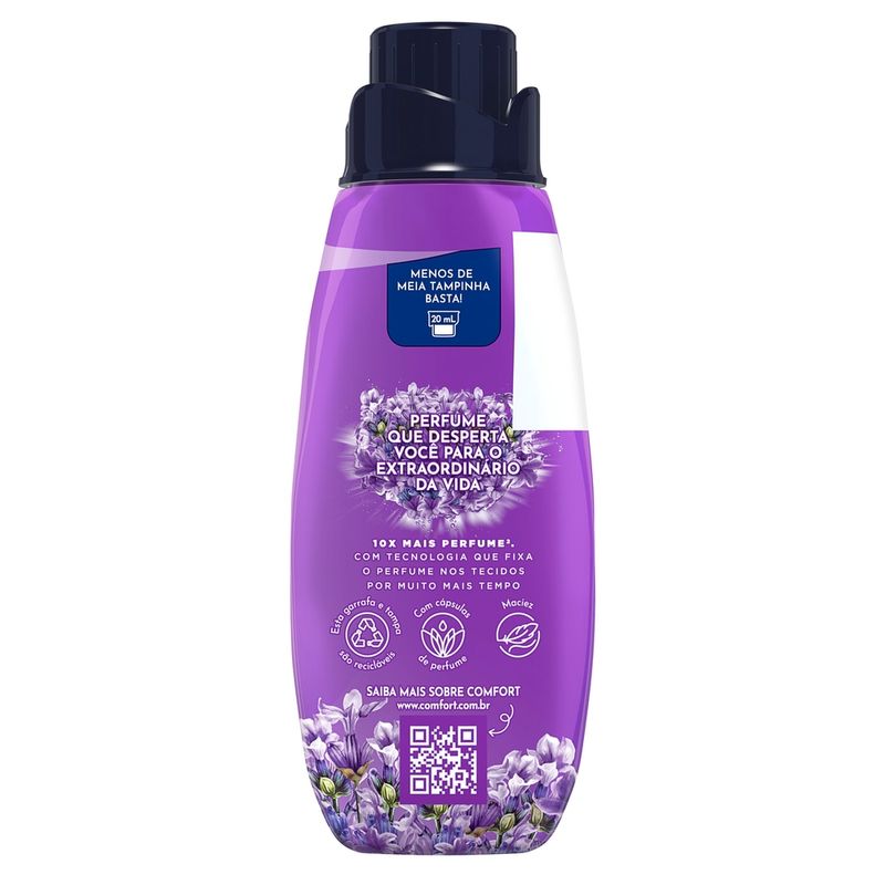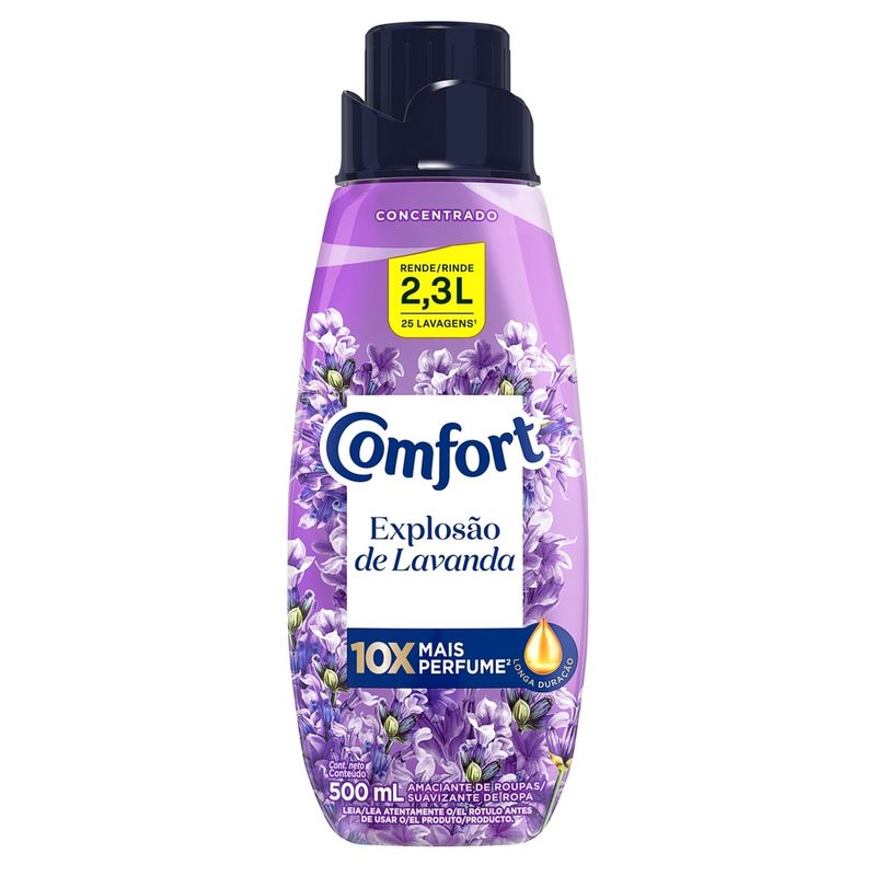 O Amaciante Concentrado Comfort Lavanda tem 10x mais perfume** para deixar suas roupas perfumadas por muito mais tempo! Além disso, possui óleo de lavanda****, o que torna o amaciante uma explosão de lavanda ainda mais intensa. Este amaciante mantém as cores*** dos tecidos vibrantes durante mais tempo, e as suas roupas maravilhosamente perfumadas. Comfort protege o tecido contra odores e deixa uma fragrância de longa duração na sua roupa! Menos de meia tampinha do Comfort Concentrado Lavanda é suficiente para lavar a sua roupa. Sua fórmula, além de perfumar as roupas, é capaz de alinhar e proteger o tecido***, reduzindo o atrito entre as fibras durante o processo de lavagem. Comfort Concentrado tem fragrância encapsulada que penetra no tecido durante o processo de lavagem, deixando a sua roupa com um perfume intenso e duradouro mesmo depois de seca! A razão? Quando se movem, estas cápsulas de perfume rompem e liberam esta incrível fragrância, fazendo com que o cheiro dure muito mais tempo! Comfort Concentrado de 500 ml rende 2,3 L, o equivalente a 25 lavagens* de roupas cuidadas e muito perfumadas! Sua garrafa e tampa são feitas de plástico 100% reciclado e reciclável, daí a sua cor cinza. Comfort é um aliado perfeito na hora de cuidar das suas roupas, pois protege os tecidos e deixa-as incrivelmente perfumadas.
