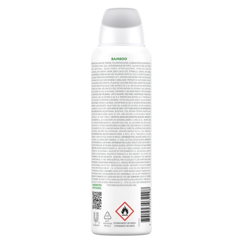 Conheça o novo Desodorante Antitranspirante Aerosol Rexona Bamboo, desenvolvido para garantir controle inteligente do suor e do mau odor. Com tecnologia que se ativa com o calor do seu corpo, ele oferece 72 horas de proteção contínua, adaptando-se ao seu ritmo e às condições da sua pele para manter você seca, fresca e confiante ao longo do dia. Sua fórmula avançada foi desenhada para se adaptar às condições das axilas, a fim de proporcionar um controle altamente eficiente do suor e do odor por 72h. Atua em sincronia com a resposta natural do suor do corpo para fornecer controle eficaz da umidade, adaptando-se ao pH do corpo para formar uma barreira que combate o suor. A prevenção do suor prejudica o crescimento de bactérias causadoras de odores, o que leva a um controle eficaz do odor, mesmo nos momentos mais intensos. Sua formulação possui 0% de álcool etílico. Sua fragrância, com uma combinação única de notas florais verdes, garante a sensação de frescor durante o dia inteiro. Para melhores resultados, agite bem antes de usar e aplique nas axilas secas a uma distância de 15 cm. Este desodorante antitranspirante não afeta a camada de ozônio, possui lata em alumínio 100% reciclável e é feito com energia elétrica 100% renovável.