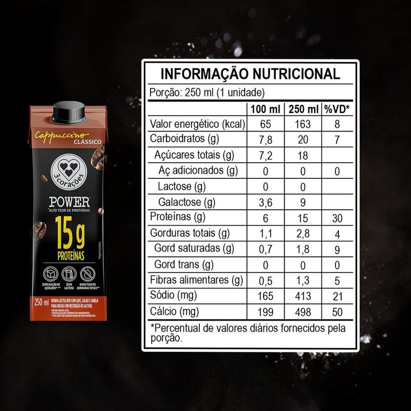 Bebida Láctea Cappuccino Power Whey 15g Classico 3 Corações 250ml