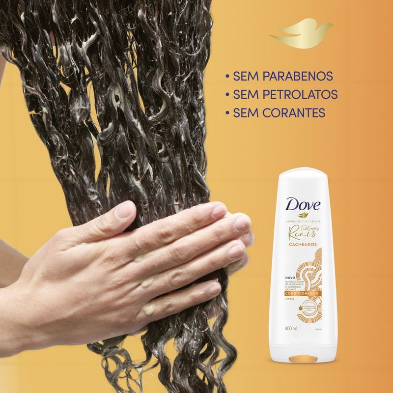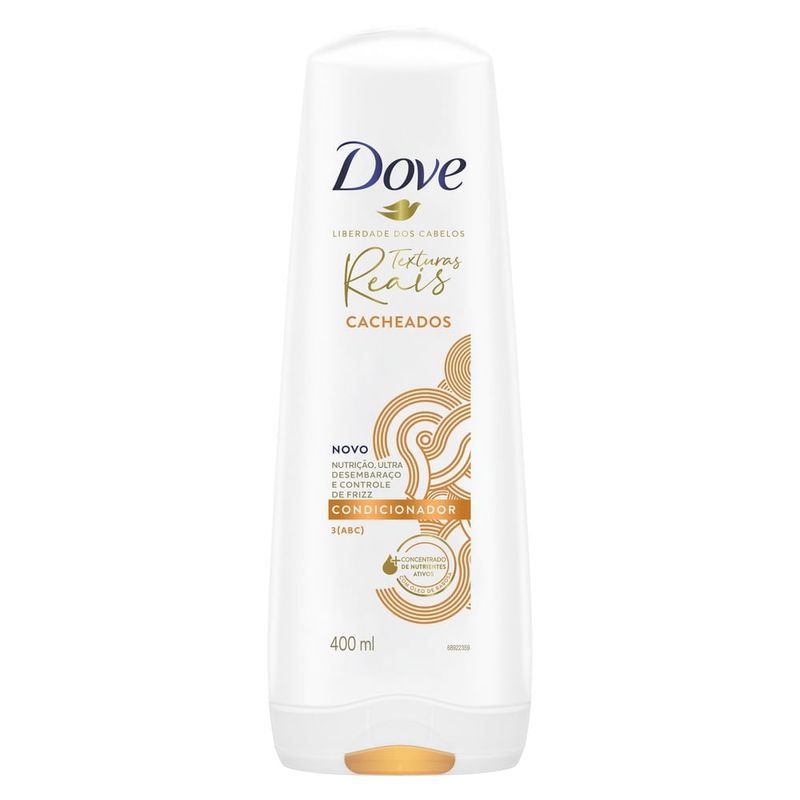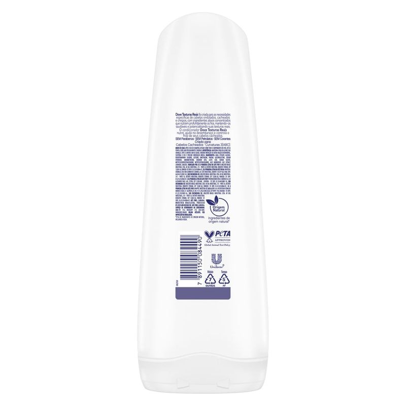 • O Condicionador Dove Texturas Reais Cacheados é feito com ingredientes ativos concentrados que nutrem profundamente os fios, mantendo-os saudáveis e potencializando suas texturas reais • O Condicionador Dove Texturas Reais Cacheados garante nutrição, ultra desembaraço e controle de frizz aos seus cabelos • É formulado com 97% de ingredientes de origem natural**, sem parabenos, petrolatos e corantes, proporcionando ultra desembaraço, nutrição e maciez aos cachos • O Condicionador Dove Cacheados foi desenvolvido com ingredientes ativos concentrados, como o óleo de babosa, que nutre e amacia profundamente os fios dos cabelos para cachos bem definidos • Criado para cabelos cacheados com Curvaturas 3 [ABC]. Para mais textura, após o uso do shampoo, aplique o condicionador sobre todo o comprimento dos fios, até às pontas. Enxague após um minuto • Para potencializar a textura de seus cachos, combine o uso deste condicionador com o Shampoo Dove Texturas Reais Cacheados e a Máscara de Tratamento Texturas Reais em seu cronograma capilar Dove Texturas Reais foi criada para as necessidades específicas de cabelos ondulados, cacheados e crespos, com ingredientes ativos concentrados que nutrem profundamente os fios, mantendo-os saudáveis e potencializando suas texturas reais.