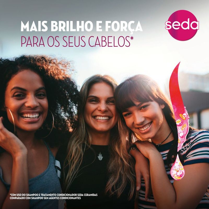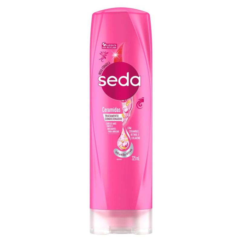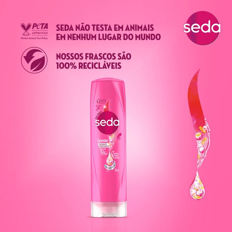 • Tratamento Condicionador com uma poderosa combinação de vitamina, óleo e proteína • Esse condicionador é indicado para cabelos sem danos a levemente danificados. O produto fortalece os fios, deixando-os nutridos e mais brilhantes. Pode ser usado diariamente • Sua fórmula contém Retinol, Ceramidas e Colágeno, conhecidos por ajudar no crescimento dos fios, fortalecer o cabelo, e propriedades hidratantes que deixam os fios alinhados e macios respectivamente • Tratamento Condicionador Seda Ceramidas conta com ingredientes poderosos, com fórmula de rápida absorção e ação • O tratamento condicionador nutre o cabelo da raiz às pontas, deixando os fios até 5x mais fortes e com brilho o dia inteiro* • Nossa garrafa é feita com plástico 100% reciclável. Este condicionador Seda possui o logo PETA, o que significa que Seda não testa seus produtos em animais A vida é cheia de possibilidades - tenha um cabelo incrível para todas elas. Está pronta para conhecer o novo Seda? O Tratamento Condicionador Ceramidas Seda com Infusão Ativa tem uma poderosa combinação de vitamina, óleo e proteína, desenvolvido para as necessidades do seu cabelo. A sua fórmula contém Retinol, Ceramidas e Colágeno, que ajudam no crescimento dos fios, deixa-os hidratados, alinhados e fortes. Nossa nova fórmula é absorvida e age rapidamente, nutrindo o cabelo da raiz às pontas, deixando os fios até 5x mais fortes e com brilho o dia inteiro*.