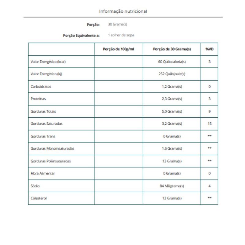 Ingredientes: Leite, creme de leite, manteiga, cloreto de sódio (sal), fermento lácteo, estabilizantes: goma xantana, goma guar e goma alfarroba e conservador sorbato de potássio.