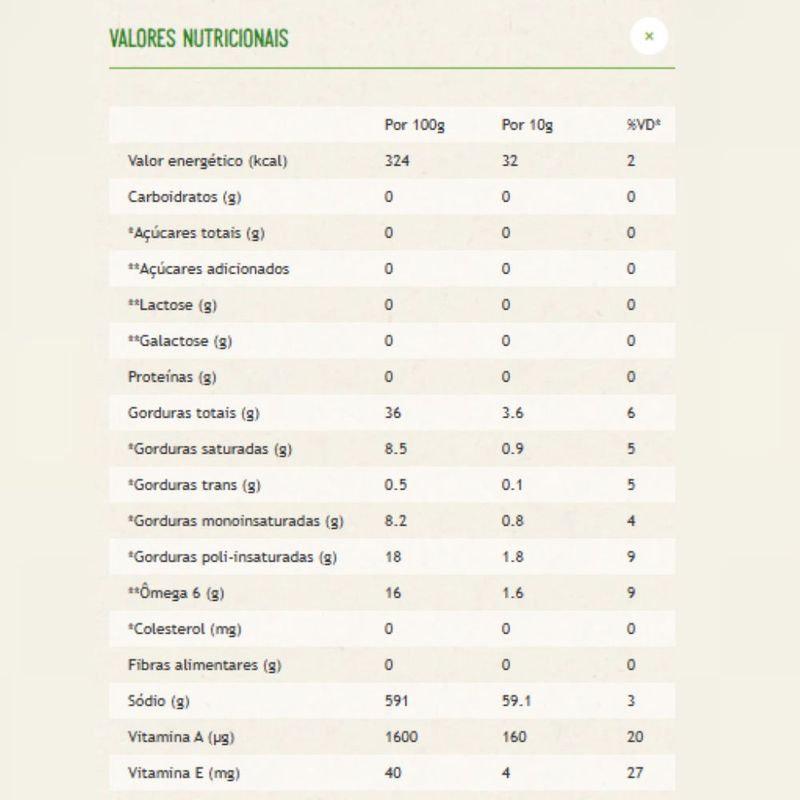 Feita com óleos vegetais, naturalmente com ômega 6. Nos tamanhos de 500 g ou 250 g.