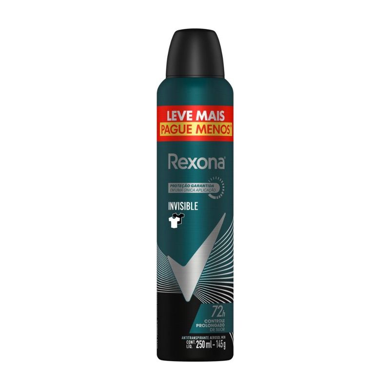 O Desodorante Aerosol Invisible Masculino Rexona proporciona proteção eficaz contra o suor e o mau odor por até 72 horas, com a vantagem de não deixar manchas indesejadas nas roupas claras ou escuras. A tecnologia MotionSense libera frescor conforme os movimentos, garantindo confiança em todas as situações. Sua fragrância masculina é marcante e refrescante, trazendo sensação de cuidado e bem-estar ao longo do dia. A embalagem promocional de 250ml “Leve+Pague-” oferece mais economia sem abrir mão da qualidade Rexona.