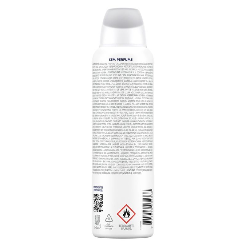 Conheça o novo Desodorante Antitranspirante Aerosol Rexona Sem Perfume, desenvolvido para garantir controle inteligente do suor e do mau odor. Com tecnologia que se ativa com o calor do seu corpo, ele oferece 72 horas de proteção contínua, adaptando-se ao seu ritmo e às condições da sua pele para manter você seca, fresca e confiante ao longo do dia. Sua fórmula avançada foi desenhada para se adaptar às condições das axilas, a fim de proporcionar um controle altamente eficiente do suor e do odor por 72h. Atua em sincronia com a resposta natural do suor do corpo para fornecer controle eficaz da umidade, adaptando-se ao pH do corpo para formar uma barreira que combate o suor. A prevenção do suor prejudica o crescimento de bactérias causadoras de odores, o que leva a um controle eficaz do odor, mesmo nos momentos mais intensos. Sua formulação possui 0% de álcool etílico e é sem fragrância para não competir com o seu perfume. Este produto é gentil com a sua pele, pois é dermatologicamente testado. Para melhores resultados, agite bem antes de usar e aplique nas axilas secas a uma distância de 15 cm. Este desodorante antitranspirante não afeta a camada de ozônio, possui lata em alumínio 100% reciclável e é feito com energia elétrica 100% renovável.