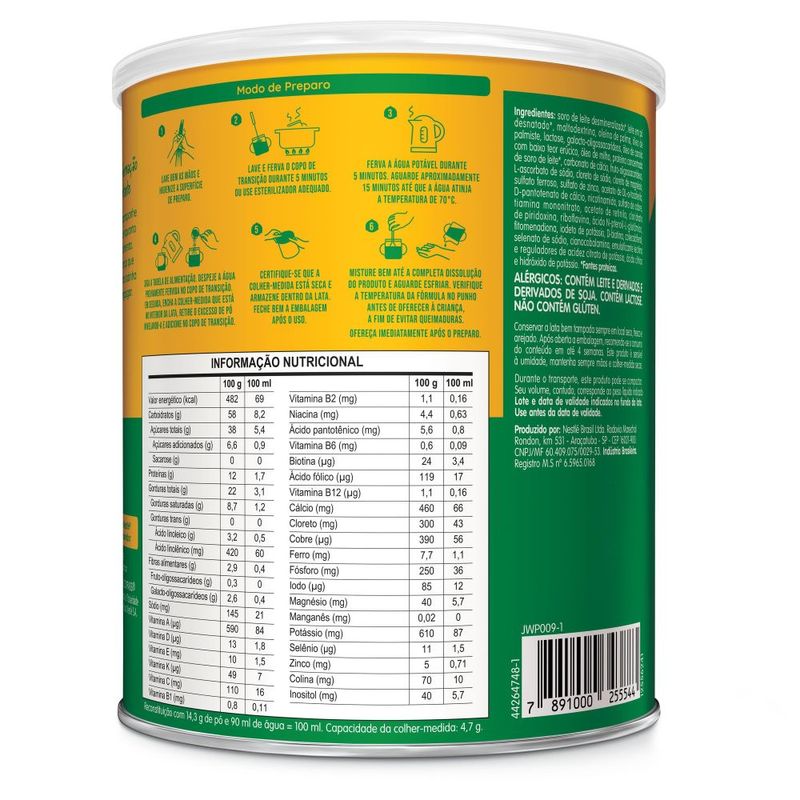 A Fórmula Infantil Nestonutri Nestlé Lata 800g é um alimento em pó desenvolvido para atender às necessidades nutricionais de crianças a partir de 1 ano, como complemento de uma alimentação equilibrada. Enriquecida com vitaminas, minerais e ferro, auxilia no crescimento e desenvolvimento saudável. A embalagem de 800g é prática e econômica. ALEITAMENTO MATERNO: "O Ministério da Saúde informa: O Aleitamento materno evita infecções e alergias e é recomendado até os dois anos de idade ou mais". Art 4º, I - NBCAL, Lei 11.265/2006". "O Ministério da Saúde informa: Após os seis meses de idade continue amamentando seu filho e ofereça novos alimentos". Art 5º, II - NBCAL, Lei 11.265/2006"