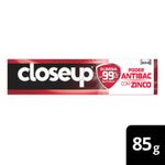 A exclusiva fórmula de Closeup Proteção Antibac entrega proteção refrescante e cuidado eficaz. Fórmula com Active Zinc - um mineral de zinco que atua na proteção contra as bactérias causadoras do mau hálito. Proporciona poderosa ação Antibac, que protege os dentes contra a placa bacteriana e também ajuda a eliminar até 99% das bactérias, e combate o mau hálito, proporcionando até 12 horas* de hálito fresco e protegido. Além disso, conta com o flúor bioativo em sua composição, que ajuda a combater a perda de minerais dos dentes, fortalecendo e protegendo-os contra as cáries. Elimina até três vezes mais bactérias em comparação a um creme dental sem zinco em sua formulação.