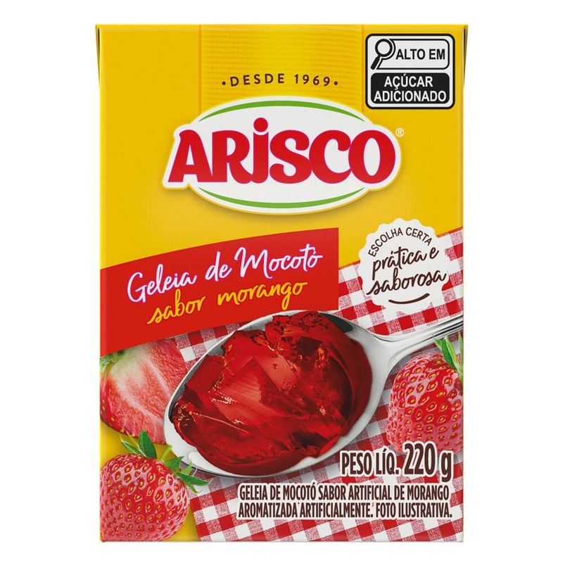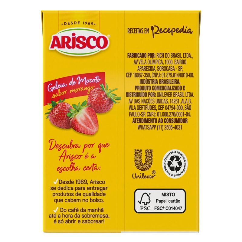 A geleia de Mocotó Arisco é uma excelente pedida para sobremesas ou o acompanhamento de refeições. Em caixinha, é prático, fácil de consumir e muito gostoso. Sabor morango.
