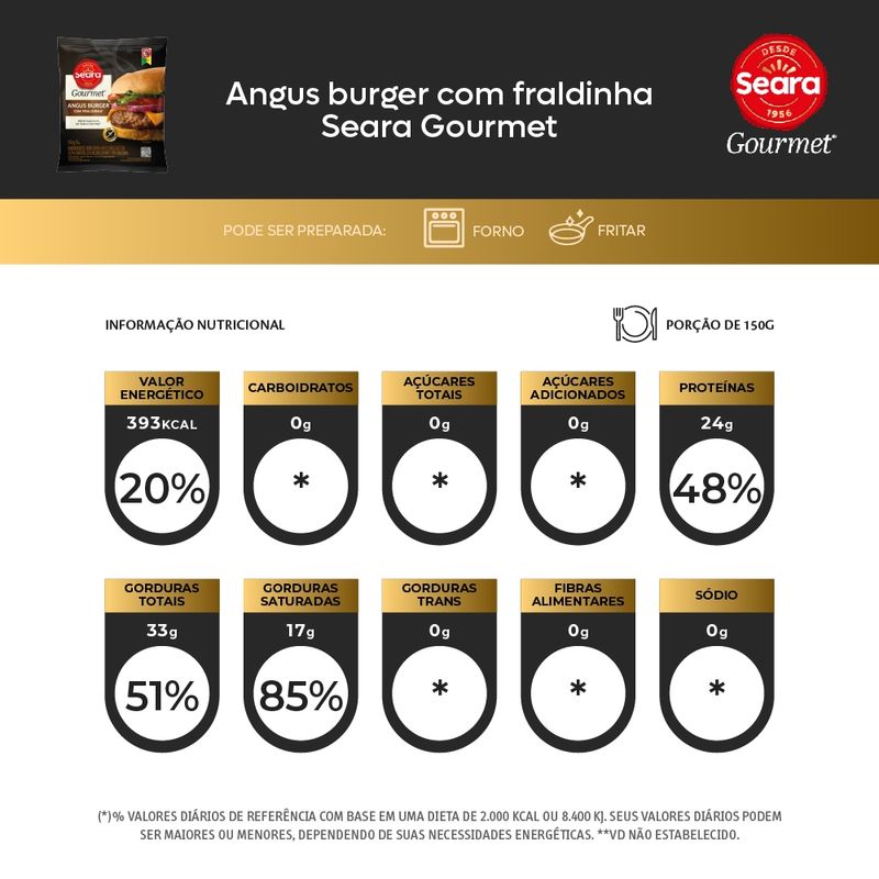O Hambúrguer Angus com Fraldinha Seara Gourmet 150g é a combinação perfeita entre a suculência da carne Angus e o sabor marcante da fraldinha, resultando em um hambúrguer artesanal de qualidade premium. Elaborado com cortes selecionados, esse hambúrguer proporciona textura macia, marmorização ideal e um paladar inconfundível, ideal para quem busca uma experiência gastronômica diferenciada em casa. Sem conservantes artificiais, é pronto para grelhar ou assar, sendo uma excelente opção para montar sanduíches gourmet ou servir como prato principal. A embalagem prática de 150g facilita o preparo individual, com padrão de padaria artesanal e sabor intenso em cada mordida.