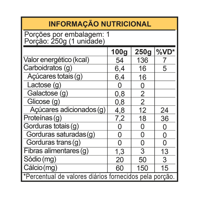 Iogurte desnatado (leite desnatado, cultura láctea e enzima lactase), água, preparado de polpa de baunilha (sucos concentrados de maçã e limão, pectina de fruta, fibra de milho, fava de baunilha e aroma natural), fibra de raiz de chicória e edulcorante natural glicosídeos de esteviol (stevia).