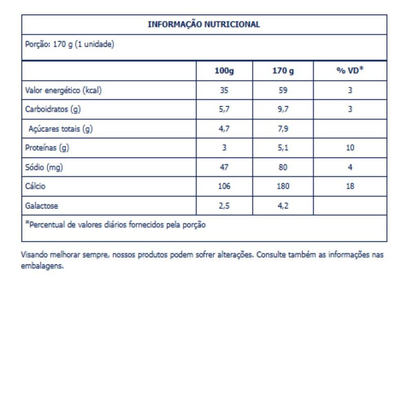 O Iogurte Líquido Batido Zero Sem Lactose Vigor 170g é a opção prática e saudável para quem busca sabor e cremosidade com zero lactose e zero adição de açúcares. Elaborado com leite desnatado e enriquecido com proteínas, cada pote de 170g oferece uma textura cremosa e aveludada, com o sabor suave e equilibrado do iogurte natural batido, sem o peso da lactose. Com apenas 69 calorias por porção, é fonte de proteínas (aproximadamente 7g) e cálcio, auxiliando na saciedade, na recuperação muscular e na saúde óssea, sendo ideal para o café da manhã, lanches rápidos, pós-treino ou como ingrediente base para vitaminas e smoothies. Livre de glúten e corantes artificiais, é perfeito para intolerantes à lactose e para toda a família que busca uma alimentação mais leve e equilibrada sem abrir mão do sabor.