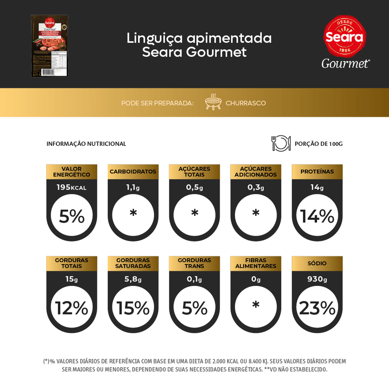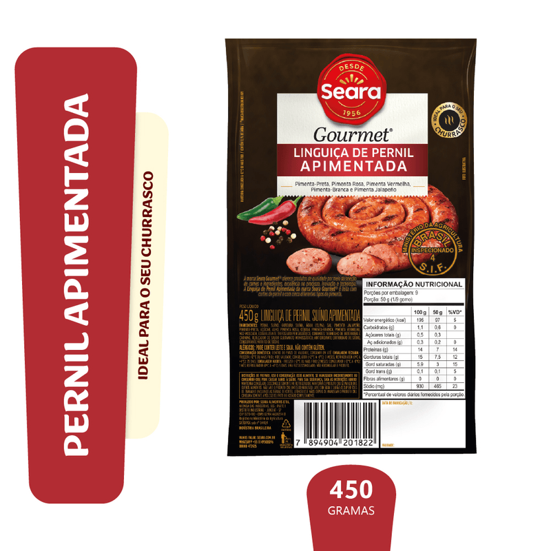 Linguiça de Pernil com Pimenta Seara Gourmet, 100% de carne de pernil suíno com delicioso tempero de pimenta-calabresa. Maciez e suculência, um toque gourmet em seus pratos.