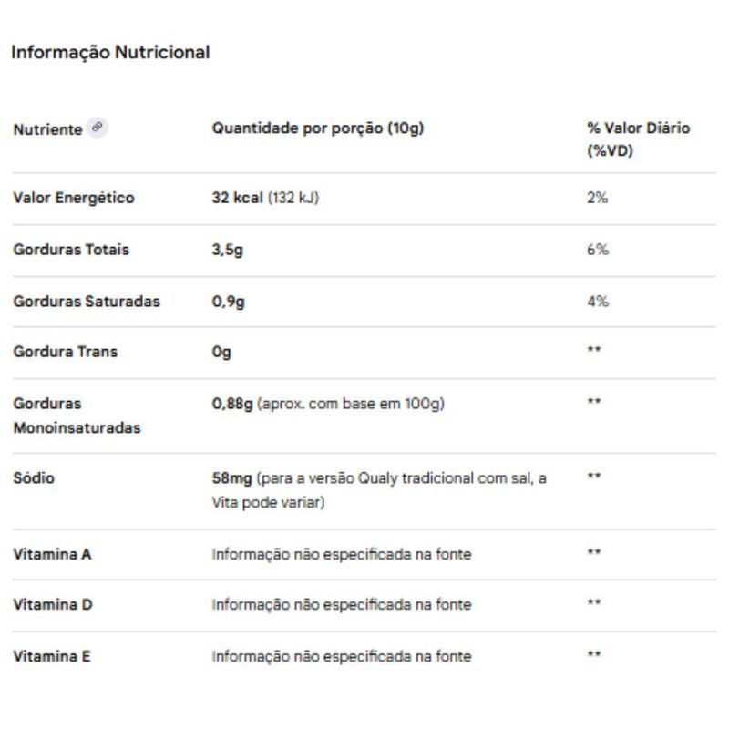 Existem mil maneiras de manter uma vida mais equilibrada e uma delas é começar seu dia com Qualy Vita.<br> Além de possuir o Ômega 6, que faz bem para o coração, Qualy Vita ainda é fonte de vitaminas A, D e E e NÃO CONTÉM LEITE em sua composição. Tudo isso com o sabor inconfundível de Qualy, nas versões com e sem sal.
