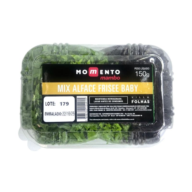 O Mix Alface Frisee Baby Momento Mambo é uma mistura de folhas jovens e crocantes, com sabor levemente amargo e textura delicada. Ideal para compor saladas sofisticadas ou servir como base para pratos leves, é uma opção prática e nutritiva. Fresca e pronta para consumo, mantém a qualidade e o frescor característicos da linha Momento Mambo.