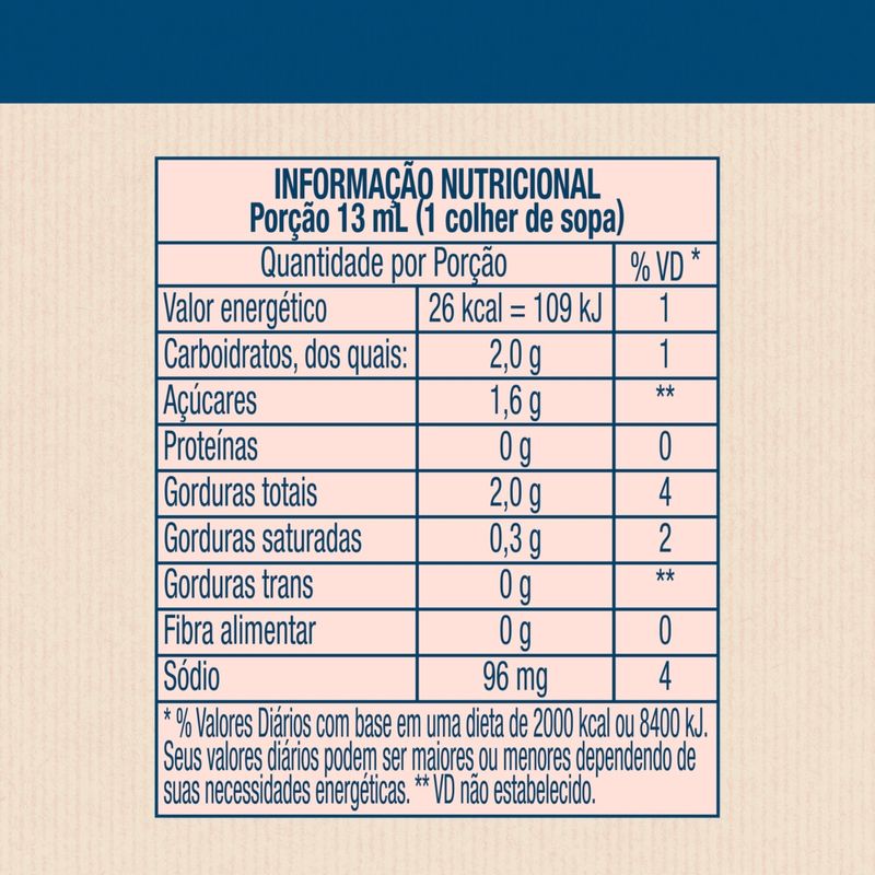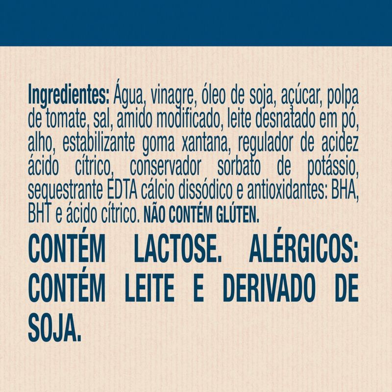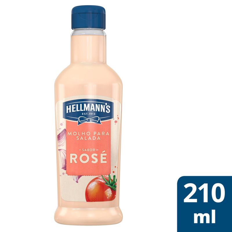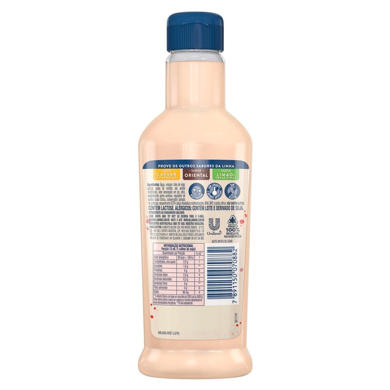 Molho para Salada Hellmann's sabor rosé, muito sabor com apenas 26 calorias. Sem corantes e aromas artificiais. Ingredientes: Água, vinagre, óleo de soja, açúcar, polpa de tomate, sal, amido modificado, leite desnatado em pó, alho, estabilizante goma xantana, regulador de acidez ácido cítrico, conservador sorbato de potássio, sequestrante EDTA cálcio dissódico e antioxidantes: BHA, BHT e ácido cítrico.