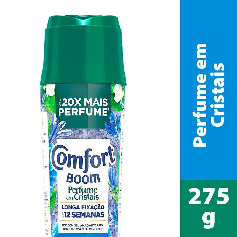 • Comfort Boom mantém suas roupas perfumadas por até 12 semanas e oferece até 20x mais perfume e 20x mais frescor *Teste analítico de Comfort amaciante concentrado + Comfort Boom Perfume em cristais comparado com marca diluída, sem perfume encapsulado, do mesmo fabricante