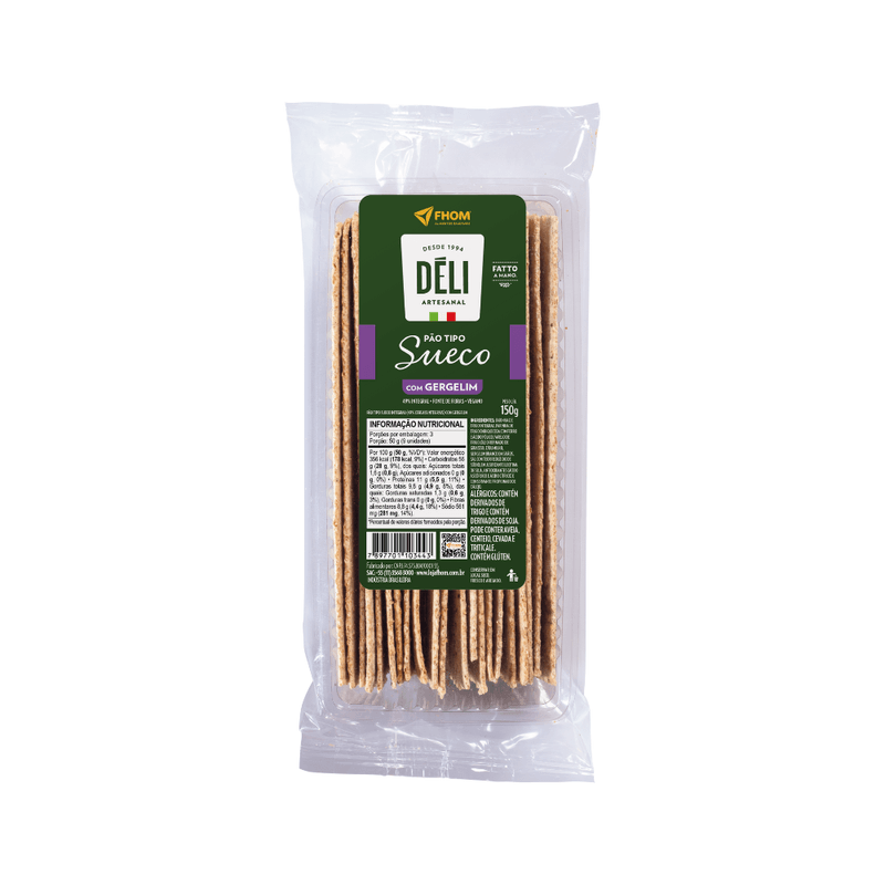 Pão sueco fininho e crocante com sementes de gergelim, oferecendo sabor suave e textura agradável. Ideal para acompanhamentos, aperitivos e cafés.