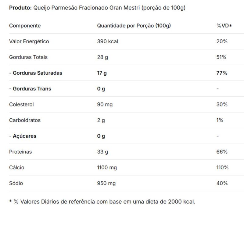 O Queijo Parmesão Fracionado Gran Mestri é um queijo duro, de longa maturação, produzido com leite de alta qualidade e técnicas tradicionais. Possui sabor intenso, levemente picante e textura firme, ideal para ser ralado ou cortado em lascas. Muito utilizado na finalização de massas, risotos, sopas, saladas e até em tábuas de queijos. Sua crocância e sabor marcante agregam sofisticação a qualquer prato. Um queijo indispensável para amantes da gastronomia italiana e para quem busca um toque gourmet nas receitas do dia a dia.