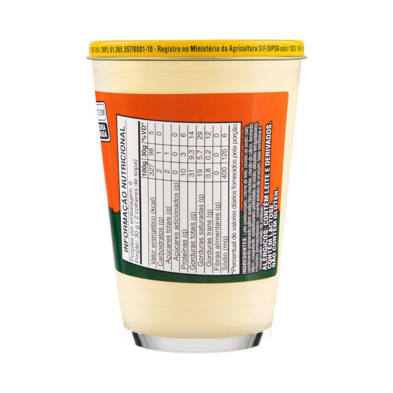Ingredientes: Leite, creme de Leite, estabilizante (pirofosfato tetrassódico INS 450 iii , hexametafosfato de sódio INS 452i e polifosfato de potássio e sódio INS 450 v, 451i e 451ii), cloreto de sódio (sal), aroma natural de queijo cheddar, cloreto de cálcio INS 509, conservante sorbato de potássio INS 202, corante natural de Urucum INS 160 b, coagulante e fermento láctico.<br> Contém lactose. Não contém glúten. Alérgicos: contém leite e derivados de leite.