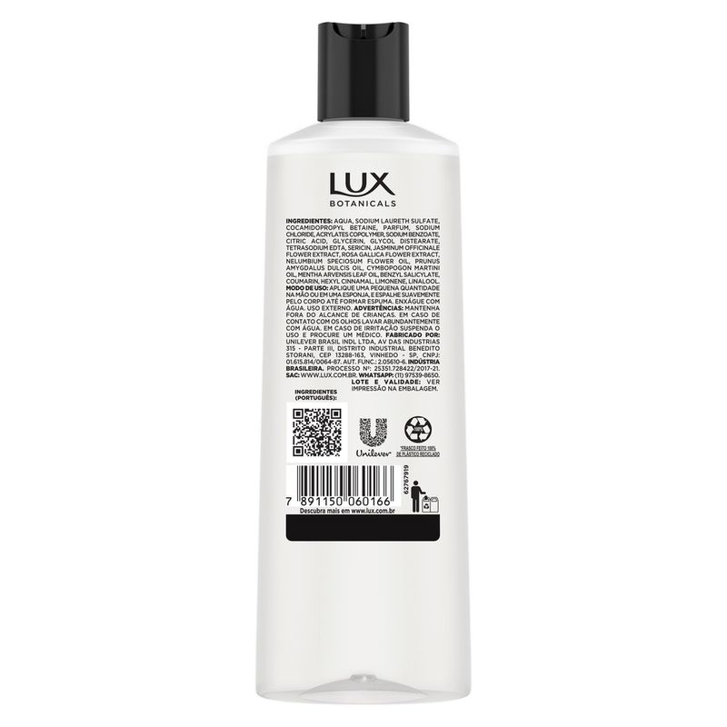 • Sinta na pele até 12 horas de perfume poderoso. Você poderosa o dia todo! • O Sabonete Líquido Lux Botanicals Buquê de Jasmim possui uma delicada fragrância floral que revigora sua pele • Sua fórmula é enriquecida com óleo botânico de beleza, uma mistura de ingredientes naturais que ajudam a manter sua pele macia e suave, proporcionando uma experiência de banho superior • O sabonete líquido corporal Lux Buquê de Jasmim deixa a sensação de pele aveludada após o banho • Este sabonete corporal é formulado com uma variedade de ingredientes naturais e é livre de parabenos • O formato garrafa do Sabonete Líquido Corporal Lux Botanicals Buquê de Jasmim é ideal para o banho proporcionando uma experiência conveniente dentro do box. Sinta até 12 horas de perfume com o Sabonete Líquido Lux Botanicals Buquê de Jasmim, desfrute de uma experiência de banho superior e uma pele irresistivelmente aveludada e perfumada, para que você se sinta poderosa o dia todo. O Sabonete Líquido Corporal Lux Botanicals Buquê de Jasmim é formulado com delicadas notas florais, criando um acorde marcante e proporcionando um banho de perfume único e especial, além de uma sensação de pele revigorada e aveludada. Sua fórmula é enriquecida com ingredientes hidratantes, como óleo botânico de beleza, uma mistura de ingredientes naturais como extratos de flores, óleos essenciais e glicerina, deixando a pele suave e ajudando a manter sua hidratação natural. O formato garrafa do Sabonete Líquido Lux Botanicals Buquê de Jasmim é feito 100% de plástico reciclado e é ideal para o banho proporcionando uma experiência conveniente dentro do box. Modo de uso: Aplique uma pequena quantidade na mão ou em uma esponja, espalhe suavemente pelo corpo até formar espuma e enxágue com água. Experimente também os formatos sabonete líquido refil e sabonete em barra de Buquê de Jasmim e conheça as demais fragrâncias: Orquídea Negra, Rosas Francesas, Lavanda e Gardênia e Óleo de Amêndoas. Transforme o toque da sua pele com os sabonetes líquidos Lux.