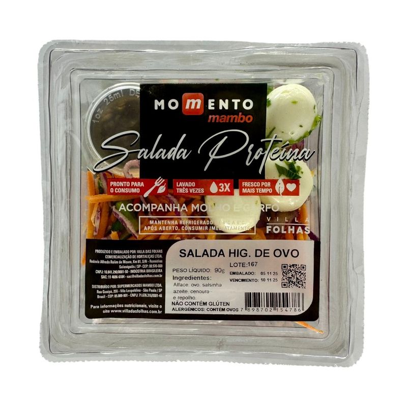 A Salada Proteína Ovo com Molho Momento Mambo é uma opção saudável e versátil, perfeita para quem deseja uma refeição leve e nutritiva. Produzida com folhas frescas, legumes selecionados e ovos cozidos, é rica em proteínas, vitaminas e minerais essenciais. O molho acompanha e complementa os sabores, tornando a experiência ainda mais saborosa. Pronta para o consumo, oferece praticidade e qualidade em cada porção, sendo ideal para o almoço, jantar ou lanche equilibrado. Frescor e nutrição na medida certa, com a excelência Momento Mambo.
