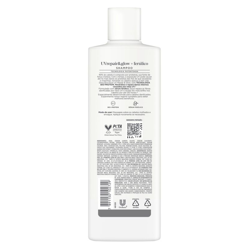 O Shampoo UV Repair & Glow + Ferúlico Dove 370ml foi desenvolvido para cuidar dos cabelos expostos ao sol e à poluição, garantindo hidratação, brilho e proteção contra danos externos. Sua fórmula enriquecida com ácido ferúlico, um poderoso antioxidante, ajuda a combater os radicais livres, prevenindo o envelhecimento precoce dos fios e mantendo a saúde capilar. O shampoo limpa suavemente, removendo impurezas sem ressecar, enquanto fortalece a fibra capilar e protege contra os efeitos nocivos dos raios UV. Ideal para uso diário, deixa os cabelos mais leves, macios e com brilho radiante. A embalagem de 370ml oferece ótimo rendimento, sendo perfeita para incluir em uma rotina de cuidados completos com os fios.