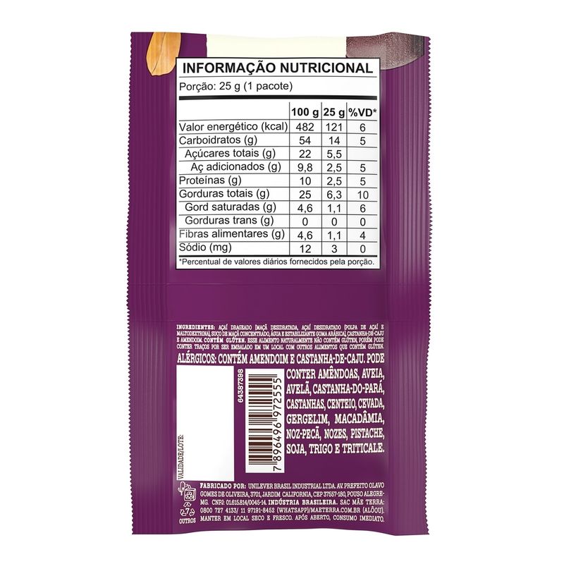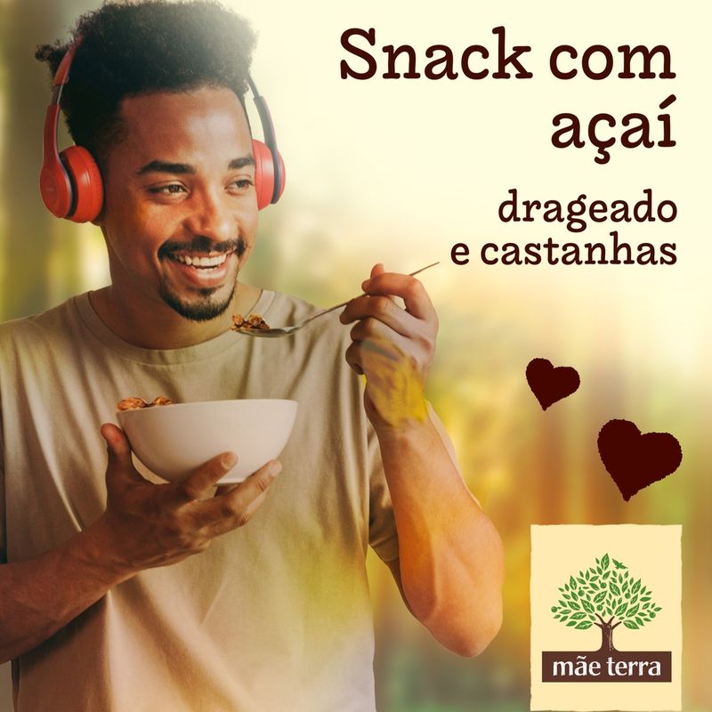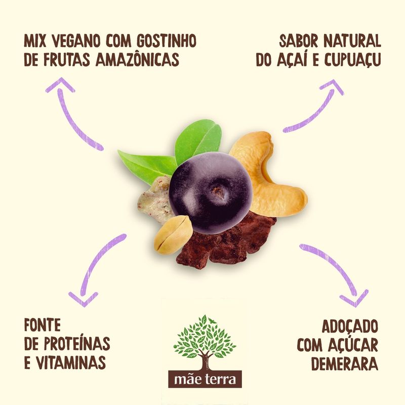 • O Remix Açaí Mãe Terra é um snack de bolso com um mix saudável de açaí e cupuaçu, prático e nutritivo, para matar a sua fome a qualquer hora e lugar • O Remix Açaí Mãe Terra é um snack saudável que apresenta uma forma diferente de sentir o gostinho das suas frutas amazônicas preferidas onde estiver, com açaí, cupuaçu, castanha-de-caju e amendoim • Um snack saudável, vegano e 100% natural, adoçado apenas com açúcar demerara e livre de qualquer aditivo artificial, fonte de fibras, minerais, vitaminas e antioxidantes • Mix de açaí e castanhas ideal para um lanche rápido e uma delícia se acrescentado em frutas, cereais, ou da forma que a sua criatividade mandar • O Remix Açaí Mãe Terra é um snack feito com ingredientes da biodiversidade brasileira, 100% natural, nutritivo, livre de aditivos artificiais, ideal para quem busca produtos veganos • Nós, mãe-terráqueos, acreditamos que a mudança começa pelo nosso prato. Por isso, temos paixão em produzir alimentos naturais, saudáveis e orgânicos que mudam o corpo, a alma e a nossa mãe Terra O Remix Açaí Mãe Terra é um snack saudável de bolso, perfeito para você levar para qualquer lugar. Esse snack da Mãe Terra é feito com frutas amazônicas, como o açaí e o cupuaçu, além de castanha-de-caju e amendoim. Nosso Remix Açaí Mãe Terra é uma forma diferente de sentir o gostinho das suas frutas amazônicas preferidas onde estiver. É adoçado apenas com açúcar demerara e livre de qualquer aditivo artificial. Pode ser consumido puro ou ser acrescentado em frutas e cereais, receitas e da forma que sua criatividade mandar. É feito com açaí e cupuaçu (combinação perfeita do sabor da Amazônia), amendoim do Pantanal e castanha-de-caju da Caatinga. Fonte de fibras, minerais, vitaminas e antioxidantes. Difícil não se apaixonar pelos nossos ingredientes brasileiros, não? Para quem busca um lanche rápido, saudável e alimentos veganos, esse mix de açaí e castanhas não possui nenhum ingrediente de origem animal, sendo um produto vegano e 100% natural, livre de transgênicos e pozinhos artificiais. Fundada em 1979, a Mãe Terra é líder no segmento de alimentos naturais e orgânicos no Brasil. E é com muita alegria que podemos dizer que somos uma Empresa B, comunidade global de organizações que buscam o desenvolvimento socioambiental, além de econômico. Temos o desafio de crescer, mas sempre respeitando os limites da natureza, valorizando a preservação ambiental e com cuidado social. Ser parte desse movimento nos mostra que estamos no caminho certo. Afinal, tem que valer a pena levantar cedo. Nós, mãe-terráqueos, acreditamos que a mudança começa pelo nosso prato. Por isso, temos paixão em produzir alimentos naturais e orgânicos que mudam o corpo, a alma e a nossa mãe Terra. Os 7 princípios da Mãe Terra são: 1. Alimentos gostosos, feitos com afeto; 2. Integral de verdade, naturalmente nutritiva; 3. Orgânicos, cada vez mais; 4. Livres de transgênicos e pozinhos artificiais; 5. Privilegiando os pequenos produtores; 6. Valorizando os ingredientes nativos do nosso Brasil; 7. Vegana, aqui só tem ingredientes vegetais. Sabemos que não somos perfeitos, mas nos esforçamos para fazer nossa parte. Vamos juntes? #AlimenteaMudança
