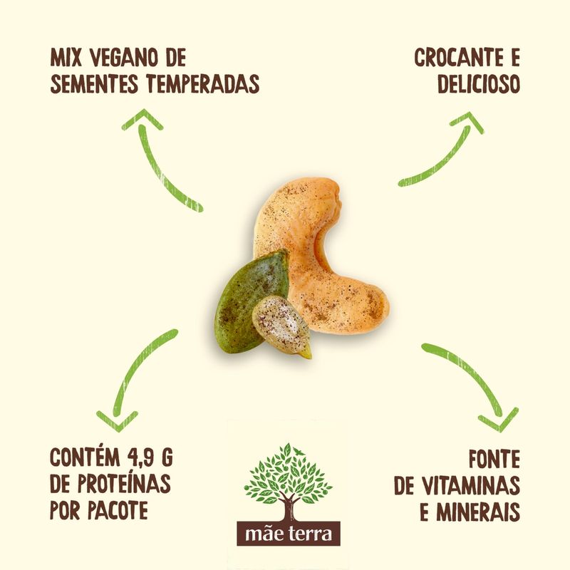 O Remix Sementes Mãe Terra é um mix saudável de bolso perfeito para você levar para qualquer lugar. Esse snack da Mãe Terra é feito com semente de girassol, castanha-de-caju e semente de abóbora. É uma deliciosa opção para lanchinho natural e saudável, com um toque de sal e pimenta-do-reino. As sementes de abóbora e girassol são excelentes fontes de vitaminas, minerais e gorduras boas, sendo uma ótima alternativa para matar a sua fome a qualquer momento do dia ou como complemento para saladas, sopas e outras refeições. Em combinação com castanhas, fica ainda mais completo e saboroso. O Remix Sementes tem 4,9 g de proteínas por pacote e é fonte de zinco, magnésio, selênio, vitamina B5 e vitamina E. Para quem busca um lanche rápido e alimentos veganos, esse mix de sementes não possui nenhum ingrediente de origem animal, sendo um produto vegano e 100% natural, livre de transgênicos e pozinhos artificiais. Fundada em 1979, a Mãe Terra é líder no segmento de alimentos naturais e orgânicos no Brasil. E é com muita alegria que podemos dizer que somos uma Empresa B, comunidade global de organizações que buscam o desenvolvimento socioambiental, além de econômico. Temos o desafio de crescer, mas sempre respeitando os limites da natureza, valorizando a preservação ambiental e com cuidado social. Ser parte desse movimento nos mostra que estamos no caminho certo. Afinal, tem que valer a pena levantar cedo. Nós, mãe-terráqueos, acreditamos que a mudança começa pelo nosso prato. Por isso, temos paixão em produzir alimentos naturais e orgânicos que mudam o corpo, a alma e a nossa mãe Terra. Os 7 princípios da Mãe Terra são: 1. Alimentos gostosos, feitos com afeto; 2. Integral de verdade, naturalmente nutritiva; 3. Orgânicos, cada vez mais; 4. Livres de transgênicos e pozinhos artificiais; 5. Privilegiando os pequenos produtores; 6. Valorizando os ingredientes nativos do nosso Brasil; 7. Vegana, aqui só tem ingredientes vegetais. Sabemos que não somos perfeitos, mas nos esforçamos para fazer nossa parte. Vamos juntes? #AlimenteaMudança