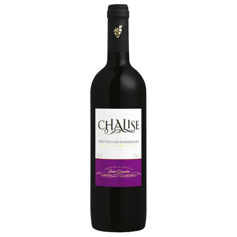 Chalise Tinto Seco. Vinho elaborado a partir de variedade de uvas, Isabel, Concord e Seibel, muito cultivadas na França, Estados Unidos e Brasil. Límpido, com coloração roxo vivo, reflexos violáceos, aroma característico de morango e framboesa, sabor suave e de grande permanência. Conteúdo 750ml. Vinho de mesa nacional.