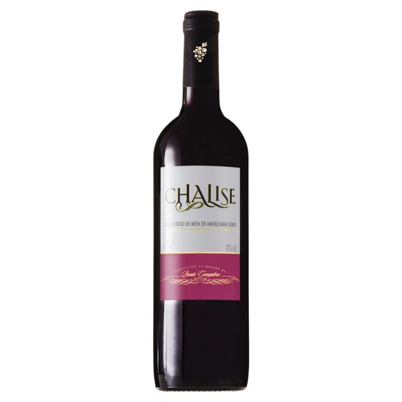 Chalise Tinto Suave. Vinho elaborado a partir da variedade de uvas Izabel, Concord e Seibel. Muito cultivadas na França, Estados Unidos e Brasil. É um vinho de coloração roxo vivo, reflexos violáceos, aroma característico de morango e framboesa, sabor suave e de grande permanência. Graduação alcoólica 11%vol. Conteúdo 750ml, vidro. Vinho de mesa nacional.